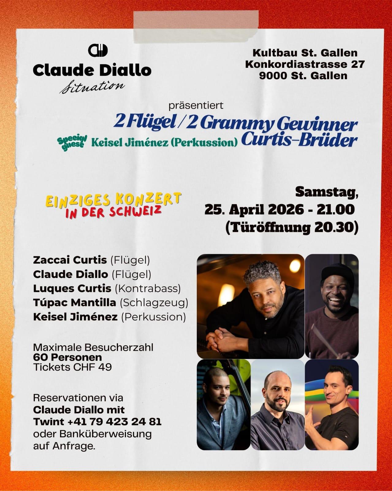 This is a once in a life time moment! Through the suggestions of some fans, Claude Diallo Situation with Grammy winning bass player Luques Curtis and percussion super star Túpac Mantilla, managed to invite the brother of Luques Curtis, incredible pianist Zaccai Curtis to join for a concert in St. Gallen. Zaccai and Luques won a Grammy for best Latin Jazz Album in 2025. The beautiful location Kult-Bau in St. Gallen offers a setting with two grand pianos. There will be duos and special features of Zaccai with Claude Diallo Situation.