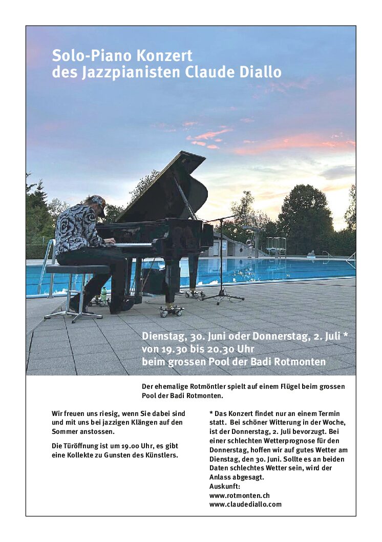 Bereits zum dritten Mal wird das solo piano Konzert von Claude Diallo beim grossen Pool der Badi Rotmonten durchgeführt. Dieser Anlass wird vom Quartierverein Rotmonten und dem Pianohaus Urs Kupferschmid mit organisiert und unterstützt. Ein Flügel wird neben den grossen Pool gestellt und Claude Diallo wird während einer Stunde in diesem wunderschönen Umfeld in seinem Lieblingsschwimmbad Eigenkompositionen und Jazzstandards in einem konzertanten Rahmen zum Besten geben. Der Anlass kostet keinen Eintritt und das Publikum darf seine Wertschätzung in Form einer Kollekte für den Künstler zeigen.