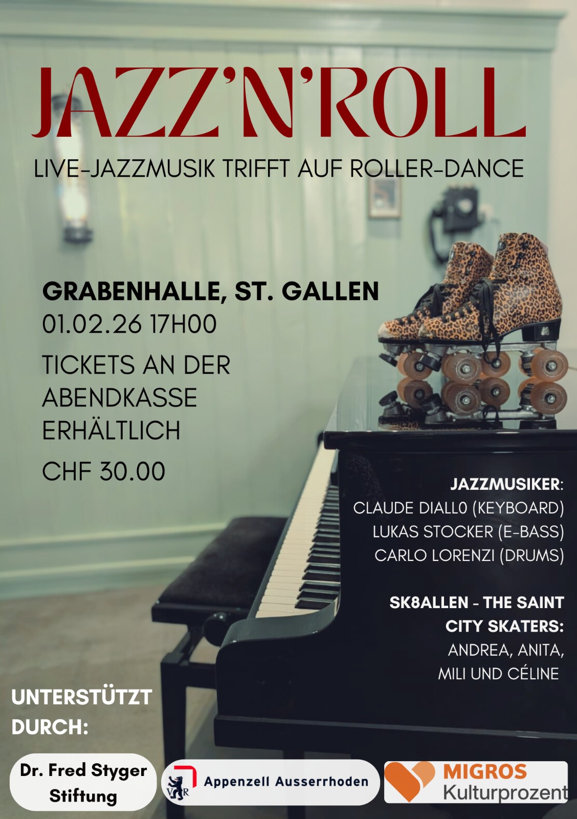 Sk8allen – The Saint City Skaters & Jazz bringt zwei Welten zusammen, die auf den ersten Blick kaum verbindbar scheinen – Rollerskating und Live-Jazz. In dieser einmaligen Premiere treffen die rhythmisch-dynamischen Bewegungen von Skaterinnen des Vereins Sk8allen auf die klangvolle Vielfalt professioneller Jazzmusiker. Was entsteht, ist eine 60-minütige Performance voller Energie, Improvisation und Poesie auf Rollen.